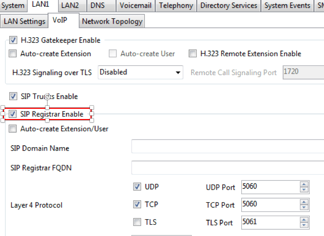We need to enable SIP, so check the box for “SIP Registrar Enable” (System>LAN1>VOIP)