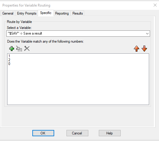 Next you have to use a ‘Variable Routing’ action, that will be the three way switch. You have to select ‘$SAV’ as the variable who’s value is used to route the call. As the matching numbers add all possible values (0, 1 and 2).